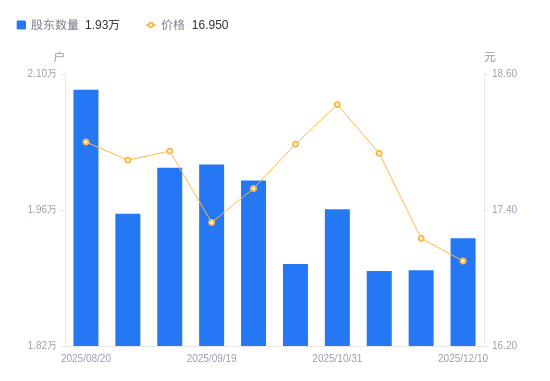 近一年(2024年12月10日至2025年12月10日),甬金股份A股股东户数从1.39万户,增加至1.93万户,增幅38.79%,区间股价下跌8.10%。