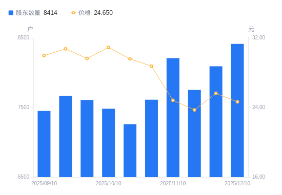 近一年(2024年12月31日至2025年12月10日),山科智能A股股东户数从8255户,增加至8414户,增幅1.93%,区间股价上涨35.35%。
