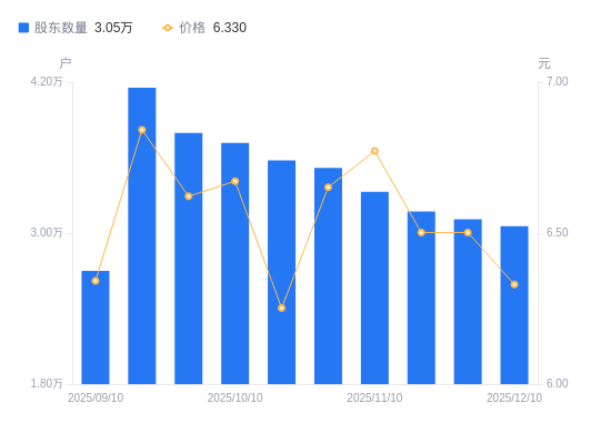近一年(2024年12月20日至2025年12月10日),中汽股份A股股东户数从3.37万户,减低至3.05万户,降幅9.46%,区间股价上涨0.48%。