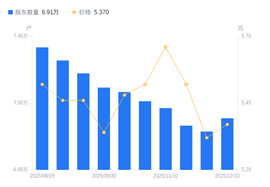 近一年(2024年12月10日至2025年12月10日),珠海港A股股东户数从7.12万户,减低至6.91万户,降幅2.96%,区间股价下跌4.55%。