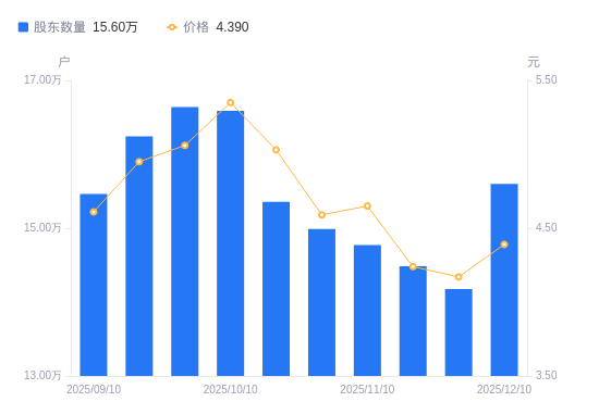 近一年(2024年12月20日至2025年12月10日),中超控股A股股东户数从7.59万户,增加至15.6万户,增幅105.52%,区间股价上涨49.83%。