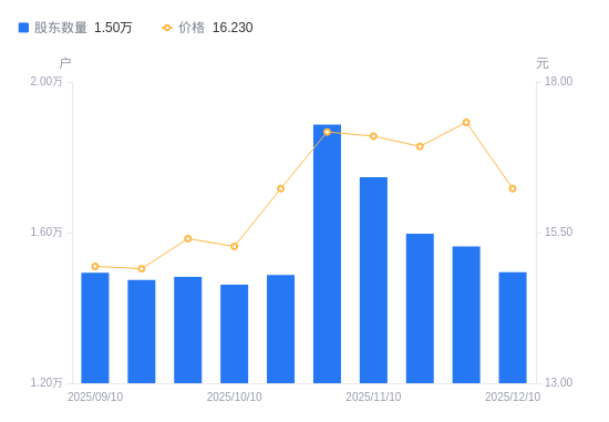 近一年(2024年12月10日至2025年12月10日),建科院A股股东户数从2.05万户,减低至1.5万户,降幅26.90%,区间股价下跌4.64%。