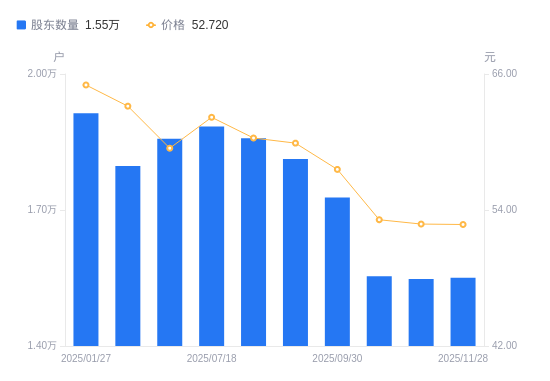 近一年(2024年12月20日至2025年11月20日),亚康股份A股股东户数从2.15万户,减低至1.55万户,降幅27.88%,区间股价下跌34.61%。