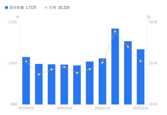 近一年(2024年12月10日至2025年12月10日),同兴科技A股股东户数从1.77万户,减低至1.71万户,降幅3.81%,区间股价上涨17.25%。