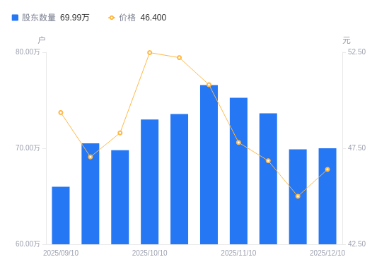 近一年(2024年12月31日至2025年12月10日),北方稀土A股股东户数从48.16万户,增加至69.99万户,增幅45.33%,区间股价上涨113.38%。
