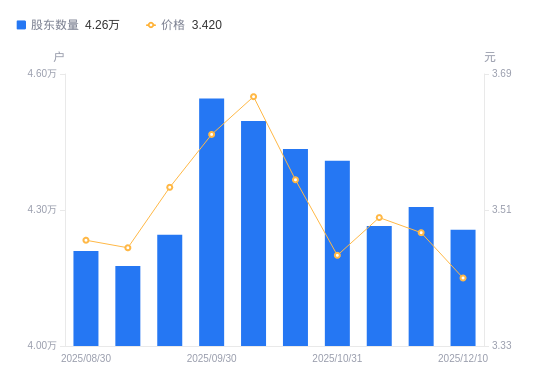 近一年(2024年12月10日至2025年12月10日),阳光照明A股股东户数从3.82万户,增加至4.26万户,增幅11.40%,区间股价上涨2.70%。