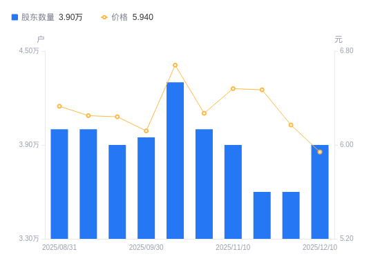近一年(2024年12月10日至2025年12月10日),大连热电A股股东户数从4.87万户,减低至3.9万户,降幅19.92%,区间股价下跌30.28%。