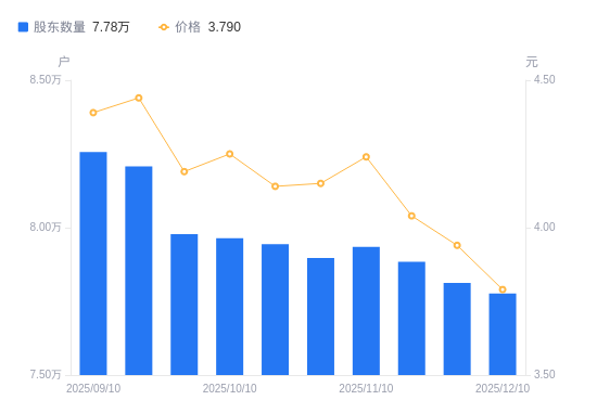 12月11日消息,数据显示,截至2025年11月28日,保税科技A股股东总户数为7.81万户,较上期(2025年11月20日)减少716户,降幅0.91%。公司最新A股总股本为12亿股,其中流通A股12亿股,户均持有流通A股数量为1.54万股,较上期增加139.52股,增幅0.92%;户均持流通A股市值6.05万元,较上期减少972.59元,降幅1.58%。