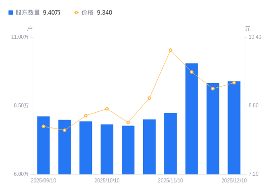 近一年(2024年12月10日至2025年12月10日),东北证券A股股东户数从8.99万户,增加至9.4万户,增幅4.58%,区间股价上涨12.94%。
