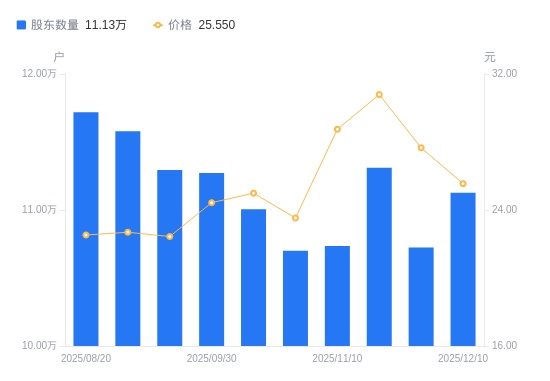 近一年(2024年12月20日至2025年12月10日),西藏矿业A股股东户数从12.12万户,减低至11.13万户,降幅8.21%,区间股价上涨14.57%。