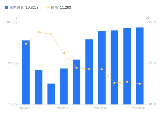 近一年(2024年12月20日至2025年12月10日),神州泰岳A股股东户数从10.53万户,减低至10.32万户,降幅1.93%,区间股价下跌9.92%。