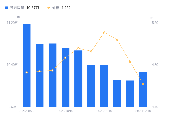 近一年(2024年12月10日至2025年12月10日),南网能源A股股东户数从11.64万户,减低至10.27万户,降幅11.77%,区间股价上涨1.01%。