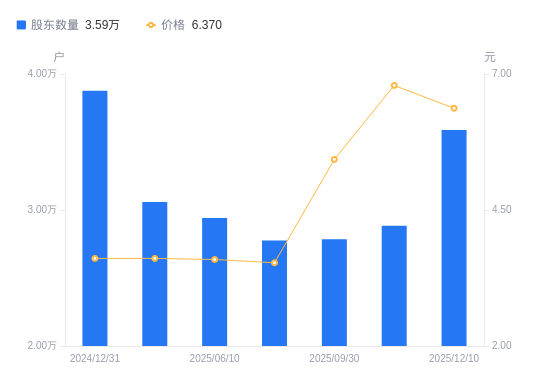 近一年(2024年12月31日至2025年12月10日),*ST正平A股股东户数从3.88万户,减低至3.59万户,降幅7.42%,区间股价上涨64.60%。