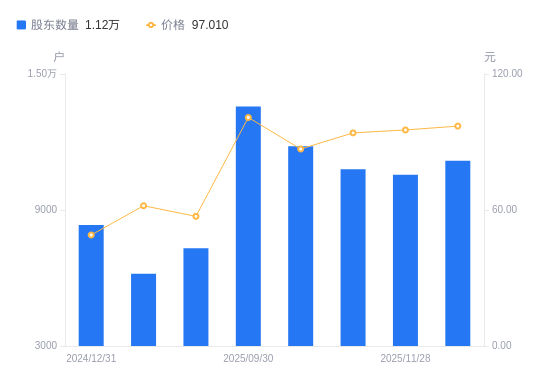 近一年(2024年12月31日至2025年12月10日),京仪装备A股股东户数从8337户,增加至1.12万户,增幅34.02%,区间股价上涨93.50%。