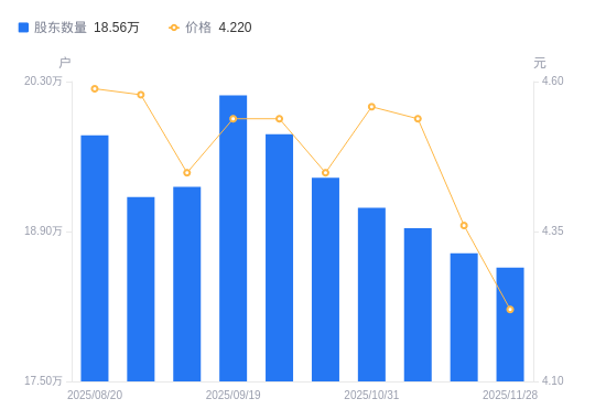 近一年(2024年11月29日至2025年11月28日),国海证券A股股东户数从26.68万户,减低至18.56万户,降幅30.41%,区间股价下跌4.48%。