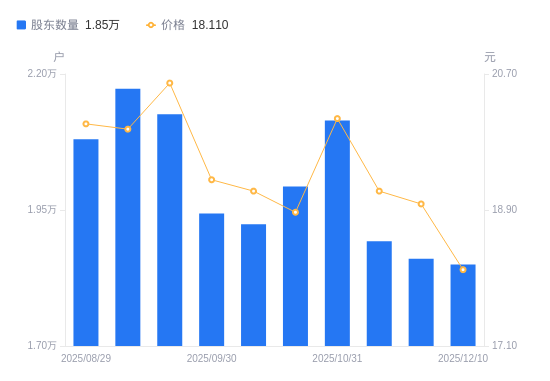 12月11日消息,数据显示,截至2025年12月10日,易明医药A股股东总户数为1.85万户,较上期(2025年11月28日)减少105户,降幅0.56%。公司最新A股总股本为1.91亿股,其中流通A股1.74亿股,户均持有流通A股数量为9423.56股,较上期增加53.19股,增幅0.57%;户均持流通A股市值17.07万元,较上期减少7189.02元,降幅4.04%。