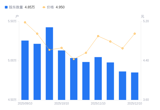 近一年(2024年12月10日至2025年12月10日),安诺其A股股东户数从6.32万户,减低至4.85万户,降幅23.33%,区间股价下跌20.55%。