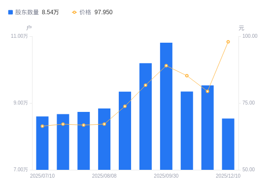 近一年(2024年12月10日至2025年12月10日),北京君正A股股东户数从7.79万户,增加至8.54万户,增幅9.61%,区间股价上涨43.01%。