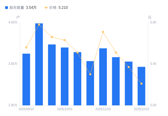 近一年(2024年12月31日至2025年12月10日),吉华集团A股股东户数从3.52万户,增加至3.54万户,增幅0.61%,区间股价上涨8.77%。