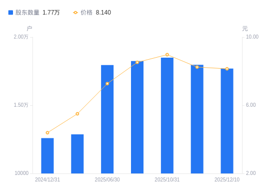 近一年(2024年12月31日至2025年12月10日),精进电动A股股东户数从1.26万户,增加至1.77万户,增幅40.56%,区间股价上涨79.69%。