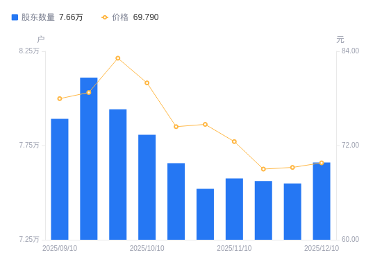 近一年(2024年12月10日至2025年12月10日),卓胜微A股股东户数从8.13万户,减低至7.66万户,降幅5.80%,区间股价下跌31.43%。