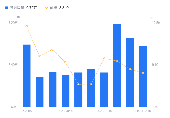 近一年(2024年12月10日至2025年12月10日),维信诺A股股东户数从8.19万户,减低至6.76万户,降幅17.41%,区间股价下跌16.13%。