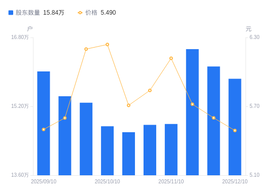 近一年(2024年12月10日至2025年12月10日),吉电股份A股股东户数从17.14万户,减低至15.84万户,降幅7.58%,区间股价下跌0.42%。