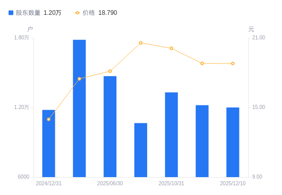 近一年(2024年12月31日至2025年12月10日),迪贝电气A股股东户数从1.18万户,增加至1.2万户,增幅1.82%,区间股价上涨31.31%。