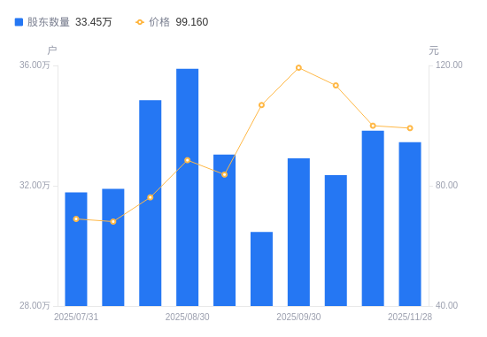 近一年(2024年11月29日至2025年11月20日),中科曙光A股股东户数从38.13万户,减低至33.83万户,降幅11.26%,区间股价上涨22.70%。