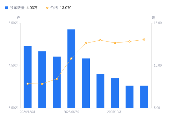 近一年(2024年12月31日至2025年11月30日),利尔化学A股股东户数从4.96万户,减低至4.03万户,降幅18.84%,区间股价上涨59.50%。