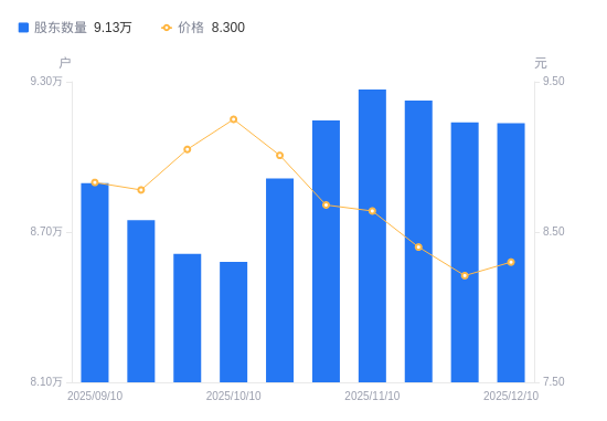 近一年(2024年12月10日至2025年12月10日),国元证券A股股东户数从10.25万户,减低至9.13万户,降幅10.90%,区间股价下跌1.66%。