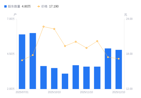 近一年(2024年12月10日至2025年12月10日),北化股份A股股东户数从4.02万户,增加至4.8万户,增幅19.43%,区间股价上涨44.58%。