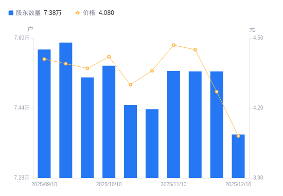 近一年(2024年12月10日至2025年12月10日),碧水源A股股东户数从8.33万户,减低至7.38万户,降幅11.42%,区间股价下跌30.80%。