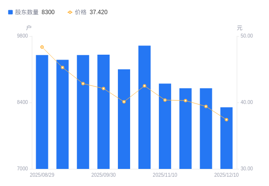 近一年(2024年12月10日至2025年12月10日),亚香股份A股股东户数从5200户,增加至8300户,增幅59.62%,区间股价上涨50.11%。