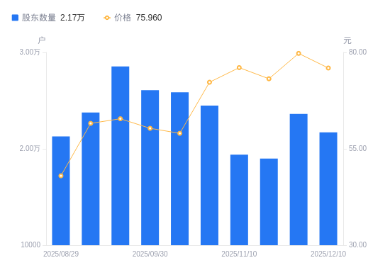 近一年(2024年12月10日至2025年12月10日),博杰股份A股股东户数从2.03万户,增加至2.17万户,增幅6.93%,区间股价上涨122.53%。