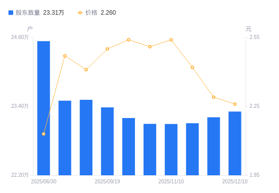 近一年(2024年12月31日至2025年12月10日),河钢股份A股股东户数从25.51万户,减低至23.31万户,降幅8.64%,区间股价上涨2.26%。