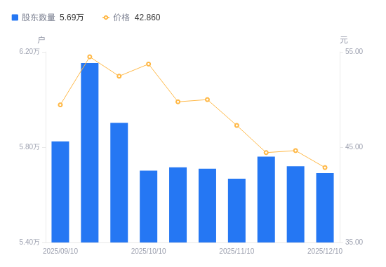 近一年(2024年12月10日至2025年12月10日),高新发展A股股东户数从8.07万户,减低至5.69万户,降幅29.46%,区间股价下跌27.89%。