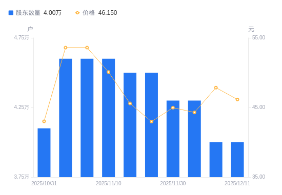 近一年(2024年12月20日至2025年12月11日),科士达A股股东户数从6.3万户,减低至4万户,降幅36.51%,区间股价上涨139.99%。