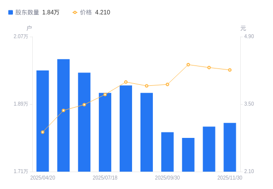 近一年(2024年12月10日至2025年11月30日),维尔利A股股东户数从2.14万户,减低至1.84万户,降幅14.02%,区间股价上涨0.96%。