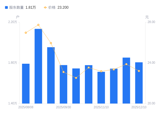 近一年(2024年12月10日至2025年12月10日),华如科技A股股东户数从2.6万户,减低至1.81万户,降幅30.46%,区间股价下跌14.11%。