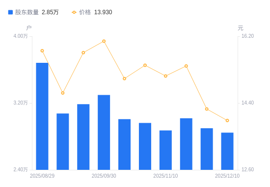12月12日消息,数据显示,截至2025年11月28日,阳谷华泰A股股东总户数为2.9万户,较上期(2025年11月20日)减少1200户,降幅3.98%。公司最新A股总股本为4.45亿股,其中流通A股4.29亿股,户均持有流通A股数量为1.48万股,较上期增加589.03股,增幅4.14%;户均持流通A股市值21.1万元,较上期减少8115.01元,降幅3.70%。