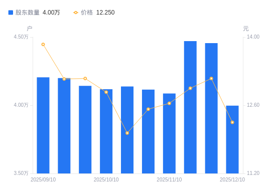 近一年(2024年12月10日至2025年12月10日),新开普A股股东户数从4万户,减低至4万户,降幅0.11%,区间股价上涨3.20%。
