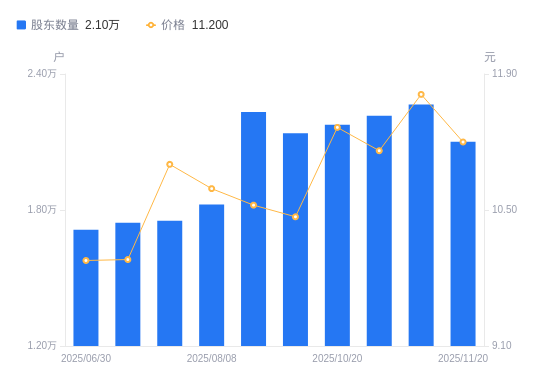 12月12日消息,数据显示,截至2025年10月31日,赞宇科技A股股东总户数为2.22万户,较上期(2025年10月20日)增加393户,增幅1.81%。公司最新A股总股本为4.7亿股,其中流通A股4.43亿股,户均持有流通A股数量为2万股,较上期减少360.91股,降幅1.77%;户均持流通A股市值22.2万元,较上期减少8892.41元,降幅3.85%。