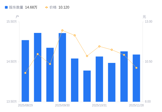近一年(2024年11月29日至2025年11月28日),中国宝安A股股东户数从16.86万户,减低至14.68万户,降幅12.92%,区间股价上涨3.05%。