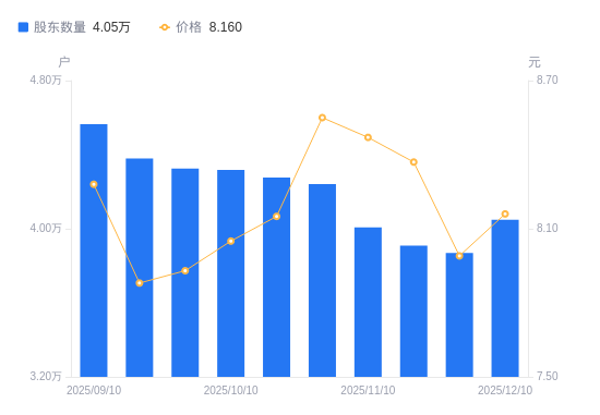 近一年(2024年12月31日至2025年12月10日),九鼎新材A股股东户数从3.57万户,增加至4.05万户,增幅13.38%,区间股价上涨54.37%。