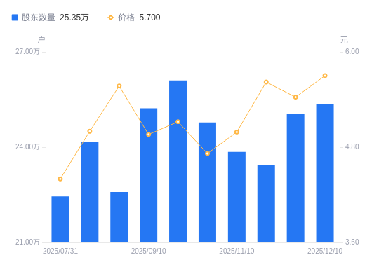 12月15日消息,数据显示,截至2025年12月10日,华映科技A股股东总户数为25.35万户,较上期(2025年11月28日)增加3010户,增幅1.20%。公司最新A股总股本为27.66亿股,其中流通A股27.63亿股,户均持有流通A股数量为1.09万股,较上期减少130.97股,降幅1.19%;户均持流通A股市值6.21万元,较上期增加2231.7元,增幅3.73%。