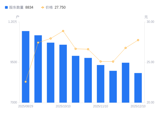 近一年(2024年12月10日至2025年12月10日),星华新材A股股东户数从1.15万户,减低至8834户,降幅23.26%,区间股价上涨65.42%。
