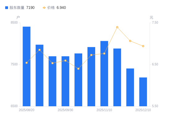近一年(2024年12月20日至2025年12月10日),*ST交投A股股东户数从7402户,减低至7190户,降幅2.86%,区间股价上涨29.48%。