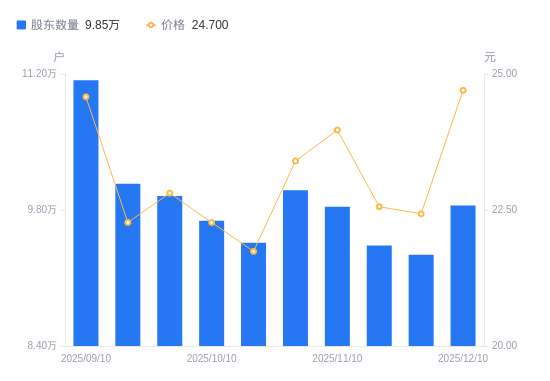 近一年(2024年12月20日至2025年12月10日),华力创通A股股东户数从10.17万户,减低至9.85万户,降幅3.19%,区间股价上涨8.19%。
