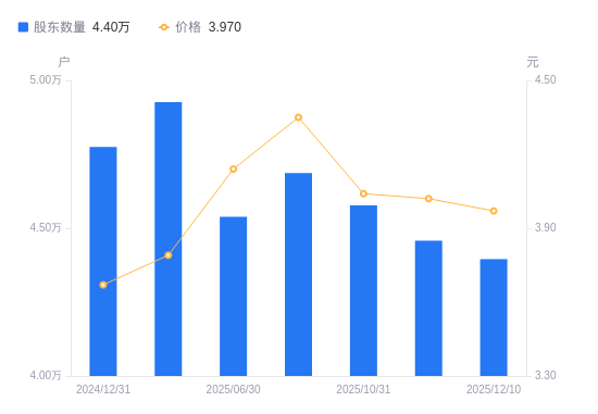 近一年(2024年12月31日至2025年12月10日),珈伟新能A股股东户数从4.77万户,减低至4.4万户,降幅7.94%,区间股价上涨5.31%。